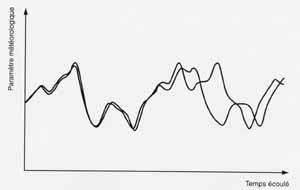 Quelques années après Rikitaké, le météorologue Edward Lorenz introduisait le premier modèle d’atmosphère sensible aux conditions initiales ; pourtant son système ne comportait que trois variables. Les modèles d’atmosphère actuels comportent un très grand nombre de variables, mais ils présentent aussi une grande sensibilité aux conditions initiales : dix hypothèses compatibles avec les relevés météorologiques conduisent à dix prévisions, parfois complètement différentes, du temps qu’il fera la semaine suivante. Les météorologues tentent de définir un horizon (une échéance) de prévisibilité. Actuellement, I’échéance de fiabilité des prédictions météorologiques est d’une semaine.