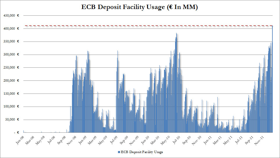 "Pour éviter une paralysie du système, évacuer le spectre d’une pénurie de crédit aux entreprises et aux particuliers, et donc une récession encore plus forte, l’institut francfortois a notamment annoncé - du jamais vu - deux opérations de prêts illimités à trois ans au taux réduit, estimé à environ 1%. (...) Les établissements financiers de la zone euro ont stocké en sécurité auprès de la BCE, mardi 27 décembre des sommes records de liquidités. Ils ont en fait parqué jusqu’à 452 milliards d’euros pour 24 heures à la "facilité de dépôts" de la BCE. Ils ont préféré placer en lieu sûr leurs liquidités, plutôt que de se prêter de l’argent entre eux et dégripper un marché interbancaire sous tension, les établissements se méfiant toujours les uns des autres. Et ce, même si les dépôts au jour le jour ne sont rémunérés qu’au taux très réduit de 0,25%."