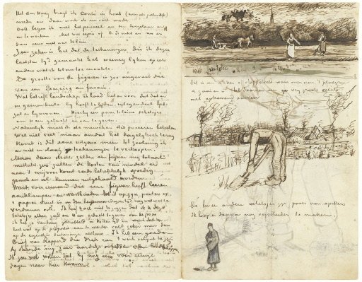 « Veuillez m’envoyer ce que tu trouves de ‘figures’ dans mes vieux dessins, j’y songe de refaire le tableau des paysans dînant, effet de lumière de lampe. Cette toile doit être toute noire à présent, peut-être pourrais-je de tête la refaire entièrement. Tu m’enverras surtout les ‘Glaneuses’ et des ‘Bêcheurs’, s’il y en a encore. Puis, si tu veux, je referai la vieille tour de Nuenen et la chaumière. »