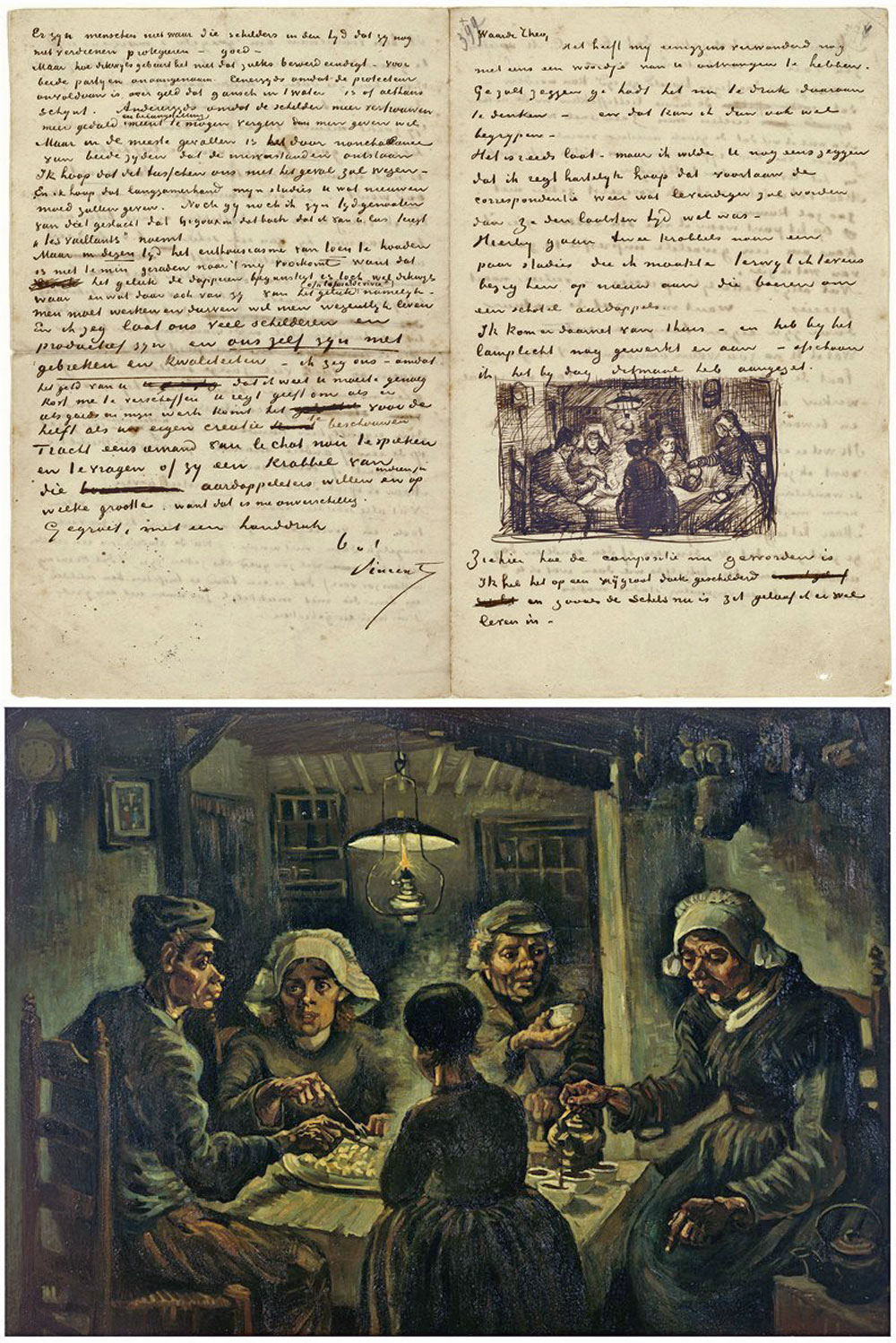 « J’ai voulu, tout en travaillant, faire en sorte qu’on ait une idée que ces petites gens, qui, à la clarté de leur lampe, mangent leur pommes de terre en puisant à même le plat avec les mains, ont eux-mêmes bêché la terre où les patates ont poussé ; ce tableau, donc, évoque le travail manuel et suggère que ces paysans ont honnêtement mérité de manger ce qu’ils mangent. […] J’ai eu en main, pendant tout cet hiver, les fils de ce tissu, cherché à en comprendre le modèle définitif ; si le tissu a pour finir un aspect rude et grossier, les fils n’en sont pas moins choisis avec soin et selon certaines règles. »