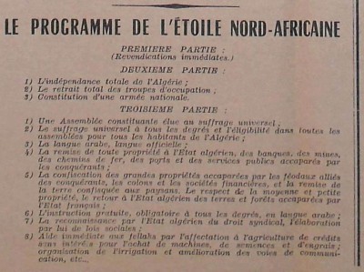 Ce programme combinait les revendications à caractères purement politique (indépendance, constitution d’une armée nationale), économique (confiscation des grandes propriétés accaparées par des féodaux alliés des conquérants, les colons et les sociétés financières, et la restitution aux paysans des terres confisquées) sociales (reconnaissance par l’Etat algérien du droit syndical, de coalition et de grève, élaboration de loi sociale) et culturel (enseignement de la langue arabe).