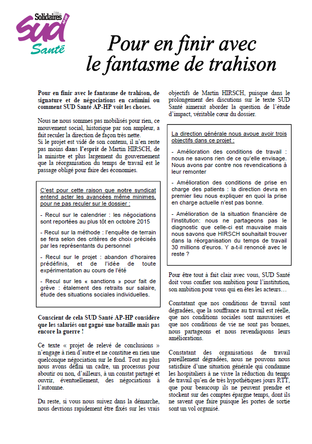 Le syndicat SUD écrit dans un tract, intitulé "Pour en finir avec le fantasme de la trahison", qu’il serait inadmissible de parler de « trahison » de l’intersyndicale ou des syndicats mais toute son attitude démontre le contraire. Le 24 juin, dans son communiqué, Sud Santé affirmait que, dans le « relevé de conclusions » de Hirsch soutenu par CFDT et SUD, Hirsch aurait « reconnu l’ampleur du mouvement social dans l’institution, et l’intersyndicale comme interlocuteur ». SUD considérait seulement qu’elle doit « ouvrir encore plus le texte » qu’elle a convenu avec Hirsch, le fameux « relevé de conclusions »…