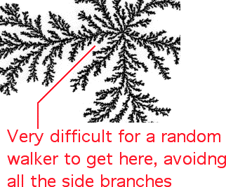 On comprend alors pourquoi le système forme des branches : le processus de DLA a tendance à favoriser, à faire grandir, les branches déjà situées le plus à l’extérieur. La structure se développe ainsi « par les pointes ».