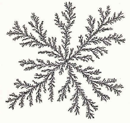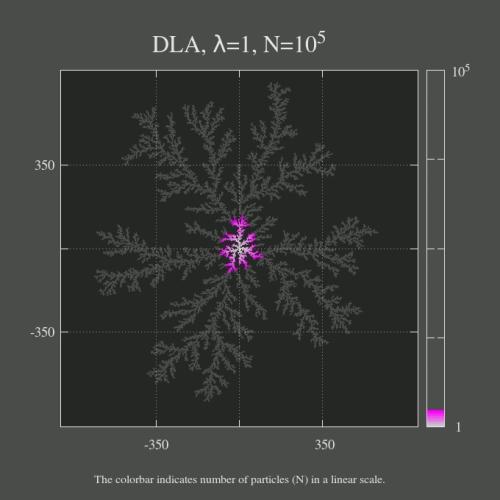 Revenons un moment sur le problème. Comme son nom l’indique, il s’agit d’agrégation (on forme un agrégat en ajoutant peu à peu des particules) limitée par la diffusion, c’est-à-dire un agrégat dont la croissance en chaque point est limitée par le nombre de particules arrivant jusque-là par diffusion (le mouvement brownien aléatoire).