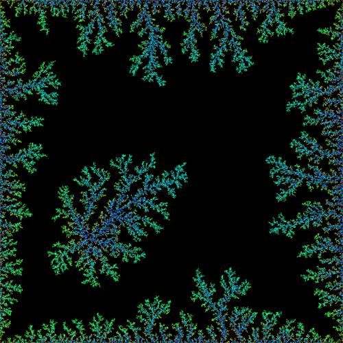 On peut dire que le cœur de la structure est fait de « bois mort », et que seule une fraction située vers l’extérieur, le « faîte » des branches, croît effectivement, c’est-à-dire reçoit les marcheurs aléatoires qui arrivent de quelque part au loin. Mais la largeur de ce faîte, la zone où « ça pousse » augmente au fur et mesure que l’amas de DLA s’agrandit. De façon réciproque, on observe que les creux, les « fjords » de la structure ne croissent pas : ils ne reçoivent aucun marcheur aléatoire. Les fjords s’allongent sans jamais se colmater.