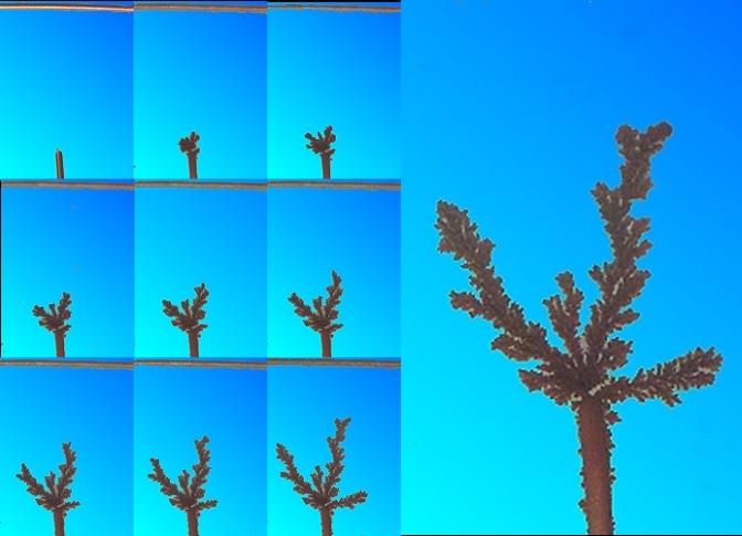 On trouve de nombreuses structures en forme de dendrites, produits de l’auto-organisation de la matière, que ce soit par dépôt d’oxydes de métaux, par exemple sur l’anode de l’électrolyseur, que ce soit par pénétration d’un milieu dans un autre avec une interface, que ce soit par développement d’un corps vivant, que ce soit par cristallisation, que ce soit par agglomération de poussières ou de grains. On appelle ces processus de formations spontanée de structures en forme de dendrites : agrégation limitée par la diffusion (ou DLA), croissance guidée par la marche au hasard, diffusion de deux phases, digitation visqueuse, croissance du sel par sursaturation, formation d’un solide par la cristallisation de son bain ou surfusion, formation solide issue de la condensation, arborescence fractale, épitaxie par jet moléculaire, croissance électrochimique, organisation de colonies de bactéries ou morphogenèse des organes branchus. Même si ces processus sont très différents les uns des autres, mettent en jeu des forces physiques différentes, tous dépendent du même processus : l’agrégation limitée par la marche aléatoire. Tous proviennent de formes issues du passage de trois dimensions à deux dimensions. Tous ces processus fabriquent spontanément des structures fractales qui sont très semblables malgré la diversité des phénomènes physiques, électrochimiques ou biologiques. Il s’agit donc bel et bien de la dialectique de l’agitation et de l’ordonné, du hasard et de la nécessité, de l’aléatoire et du structuré. Ce sont des structures issues du déséquilibre, un ordre construit sur la base du désordre. Sa logique est contradictoire : opposition ordre/désordre mais aussi opposition entre deux phases, entre deux forces physiques, entre deux milieux, entre deux états, contradiction entre le régulier et l’irrégulier, le déterminé et l’indéterminé, d’une dialectique de la simplicité et de la complexité, d’une interconnexion de la structure se construisant en marchant et des lois de construction préexistantes, une physique de l’émergence et de l’auto-organisation, une physique des contradictions entre les diverses échelles d’existence de la matière… C’est un hasard qui intervient mais pas n’importe quel hasard, le hasard dû à une loi, celle du mouvement brownien des molécules. Un hasard déterministe, quoi de plus dialectique !!! Et l’est aussi une construction fondée sur l’accroche-décroche des atomes qui se joignent à la structure et de ceux qui la quittent…