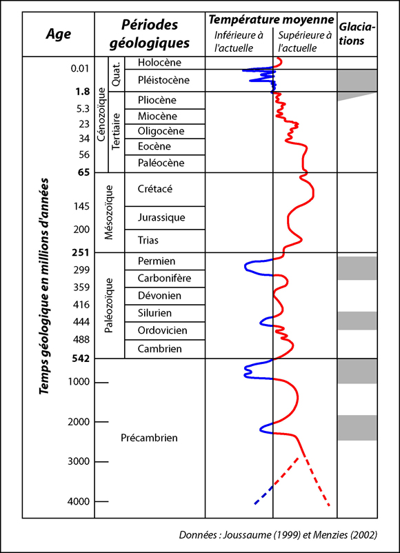 Après la glaciation permo-carbonifère, la Terre connaîtra une longue période chaude qui durera tout le Mézozoïque (de – 250 Ma à – 65 Ma).