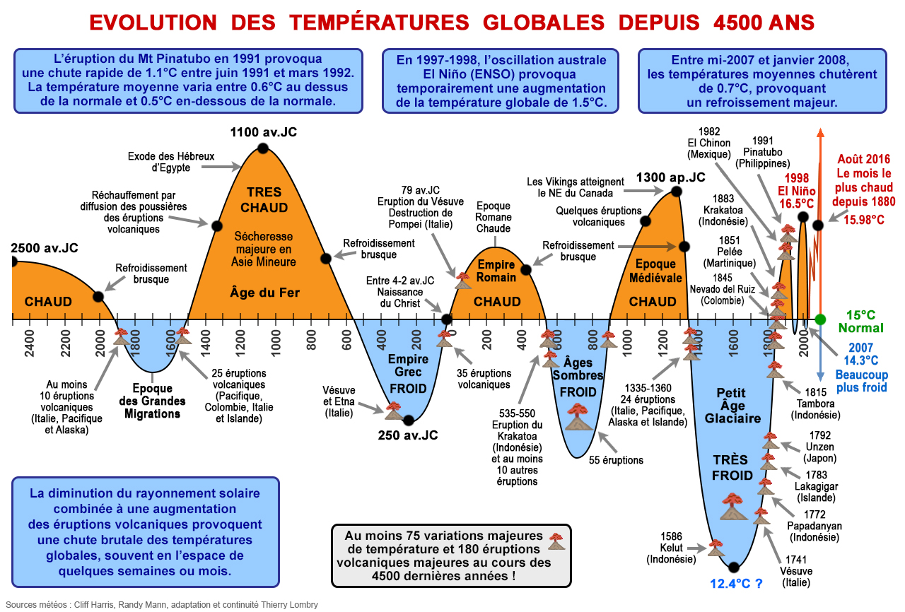 Avertissement : Actuellement, il n’est pas facile de se faire une opinion concernant le climat, tant cette question est devenue un instrument politique des classes possédantes. On entend dans les média tout et son contraire : ça va chauffer et ça va geler, à court terme et à long terme, les glaciers fondent et ils augmentent, les pôles fondent et ils augmentent, etc. C’est pour cela qu’il faut commencer par se poser la question sur ce qui pilote le fonctionnement « normal » du climat avant d’affirmer que ce fonctionnement est ou n’est pas modifié par l’homme et d’en déduire (ou pas) qu’on pourrait prédire l’avenir… On remarquera qu’il n’est même pas impossible, ni improbable, qu’il y ait à la fois une tendance au réchauffement (pas forcément d’origine humaine) et une autre tendance à la glaciation. Ce qui laisse de la marge pour ceux qui prédisent l’avenir !!! Dans ce texte, nous discutons de la glaciation plutôt que du réchauffement. On remarquera en lisant les articles que la propension à faire de « la température globale » un paramètre quasi exclusif est très exagérée.