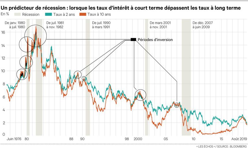 « Le taux d’intérêt sur les bons du Trésor américains à dix ans est passé temporairement sous celui des bons à deux ans. Une première depuis 2007 pour cet indicateur particulièrement redouté des marchés financiers. La bourse de New-York a connu l’une de ses pires journées de l’année. Les principaux indices de Wall Street poursuivaient leur dégringolade mercredi peu avant la clôture dans un marché toujours lesté par les craintes sur un ralentissement de l’économie mondiale. L’indice vedette de la Bourse new-yorkaise lâchait 2,78% aux alentours de 19H40 GMT, peu après être descendu sous la barre des 3%. Le Nasdaq, à forte coloration technologique, perdait 2,89%, après avoir lui aussi chuté de plus de 3% en séance, et l’indice élargi S&P 500 reculait de 2,73%. Des statistiques en provenance de Chine, où la croissance de la production industrielle est tombée en juillet au plus bas en 17 ans, et d’Allemagne, où l’activité économique s’est contractée au deuxième trimestre, ont suscité une vague d’inquiétudes. « Les données économiques en provenance de Chine et d’Allemagne sapent le moral des investisseurs », a souligné Lilan Currens de Schaeffer. La combinaison des indicateurs et de la chute des taux à long terme « accroît la peur d’une récession imminente », selon Tony Dwyer, stratégiste pour Canaccord Genuity. »