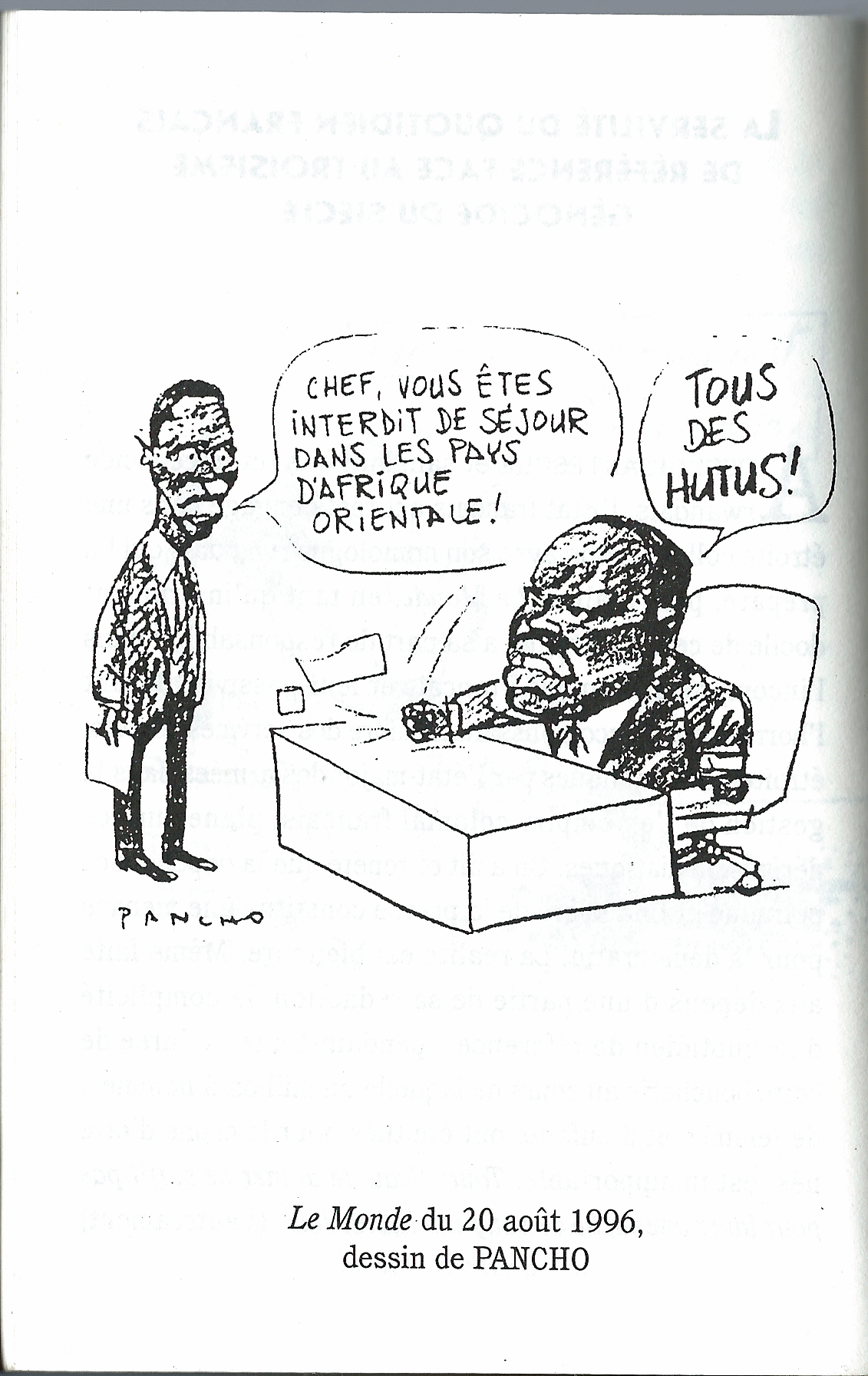 Ces deux premières caricatures illustrent à merveille la diabolisation du FPR qui s’opère dans les colonnes du Monde lors du génocide rwandais.Enfin, un dernier exemple, signé Pancho, illustre quant à lui un mécanisme plus répandu, celui de l’interprétation ethniste du conflit. Le 20 août 1996, le dessinateur illustre un article signé du journaliste Jean Hélène. Il représente le président du Burundi, Pierre Buyoya, sous la pression d’un embargo décidé par l’Ouganda et le Rwanda. Ces trois pays sont pourtant, selon l’analyse du Monde, gouvernés par les Tutsis. Le dessin illustre la réaction du président burundais face à l’embargo : « Tous des Hutu ! » lance-t-il.