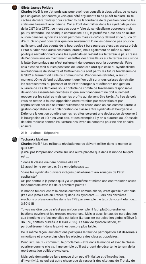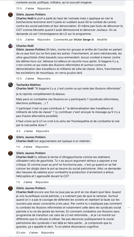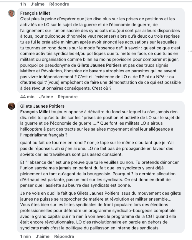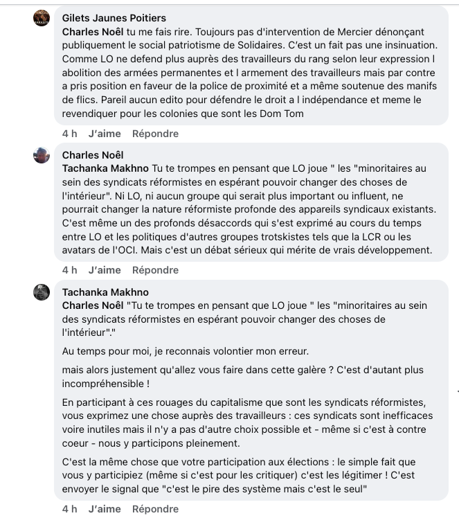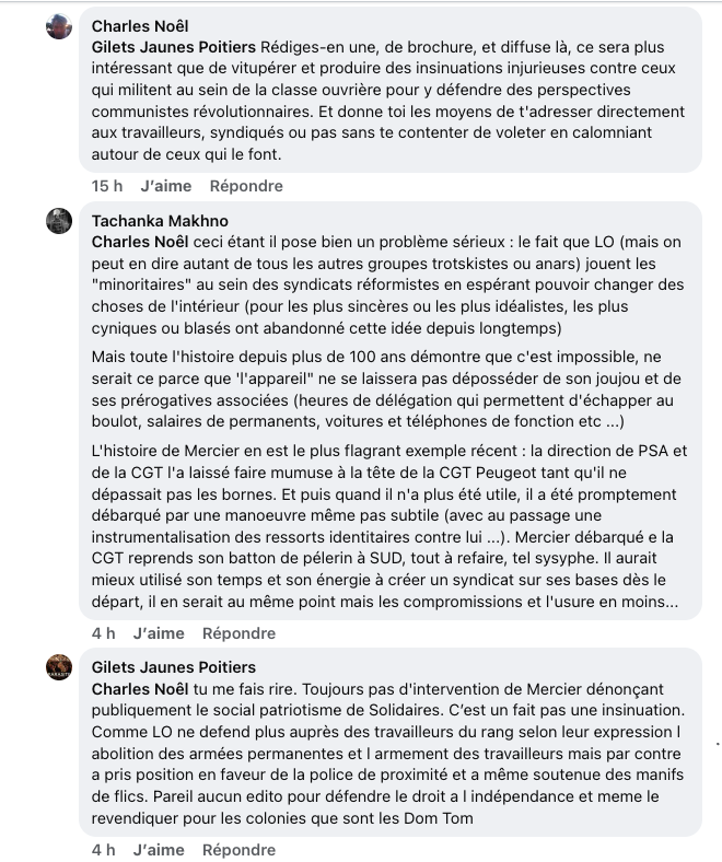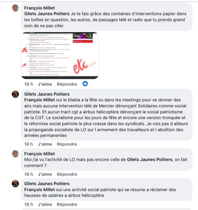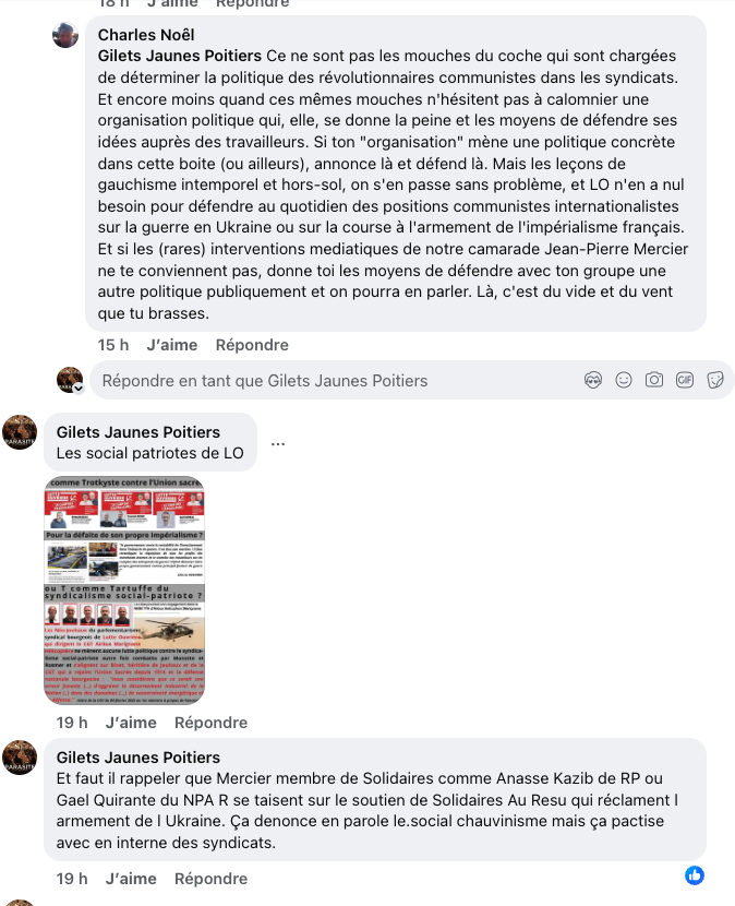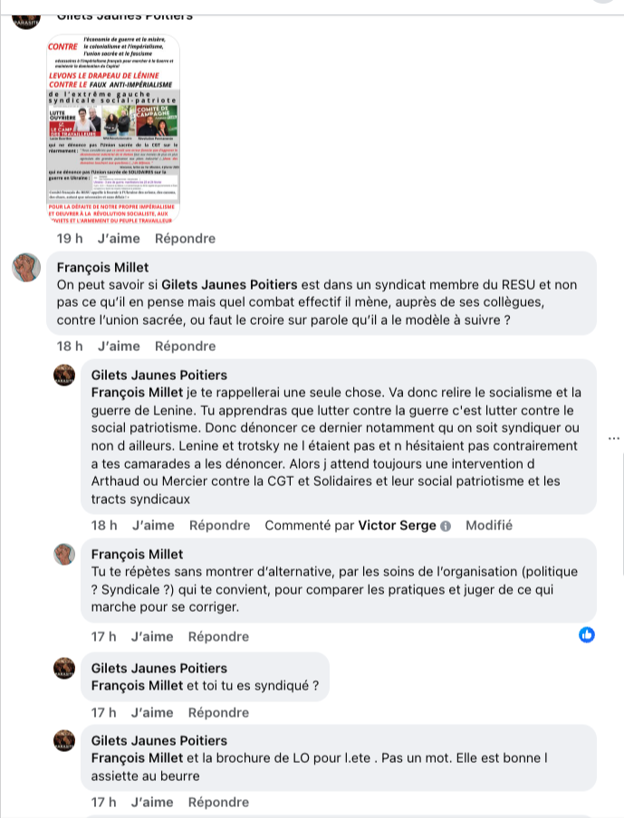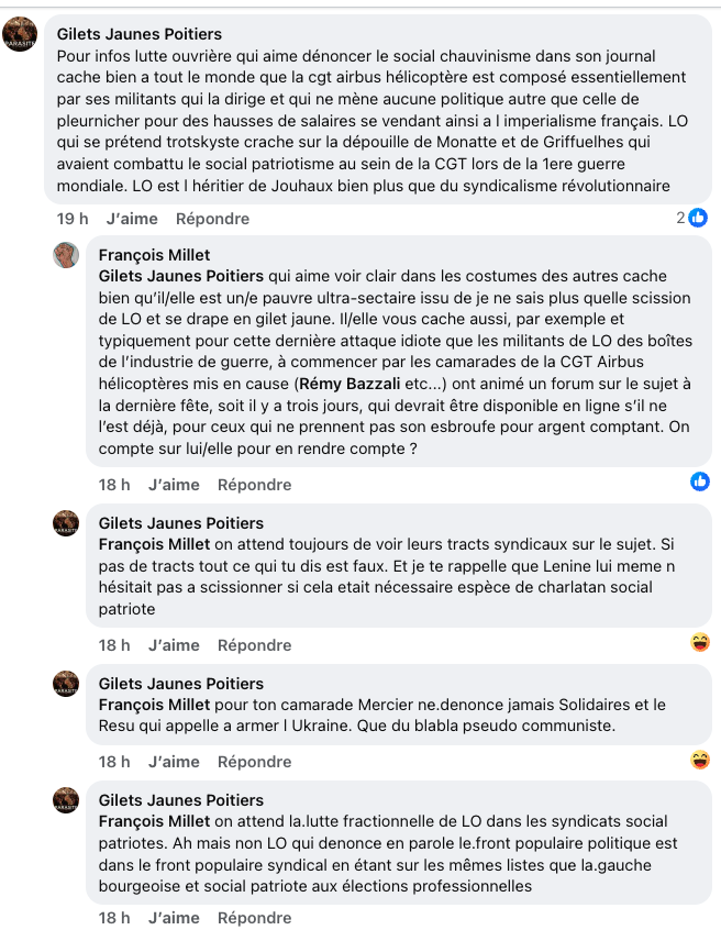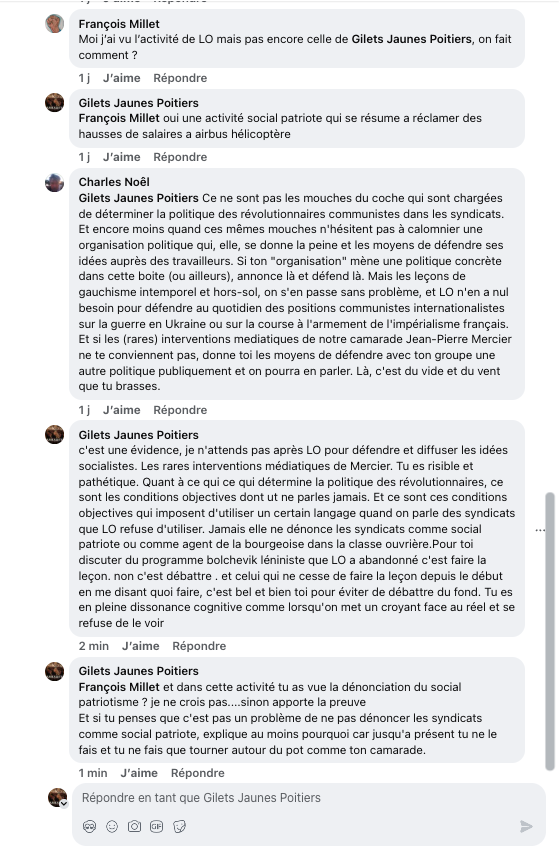 Les anciens camarades de LO qui ont connu d’autres positions de leur organisation recoivent des consignes (conseils) de ne pas défendre publiquement l’anti impérialisme et se cachent même dans des salles de pauses quand il faudrait répondre du tac o tac aux militants de la gauche syndicale social patriote, lors de prise de paroles publique comme les minutes de silence en hommage aux victimes du terrorisme de groupes armés fanatisés .
