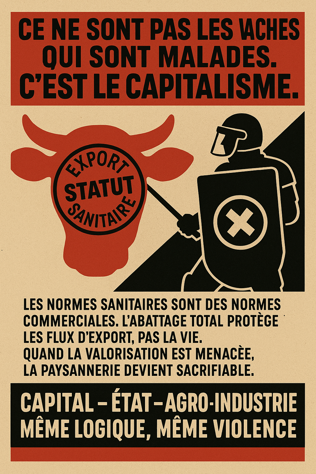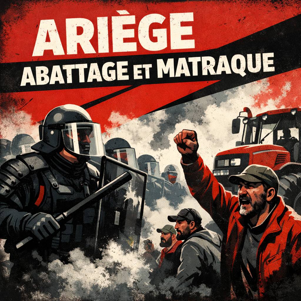 En Ariège, l’État a déployé des centaines de gendarmes/CRS pour imposer l’abattage d’un troupeau au nom de la « politique sanitaire ». Mais derrière le sanitaire, il y a la logique froide du capital : protéger le statut commercial « indemne », préserver les flux, sécuriser l’export — et faire payer la casse aux petits.