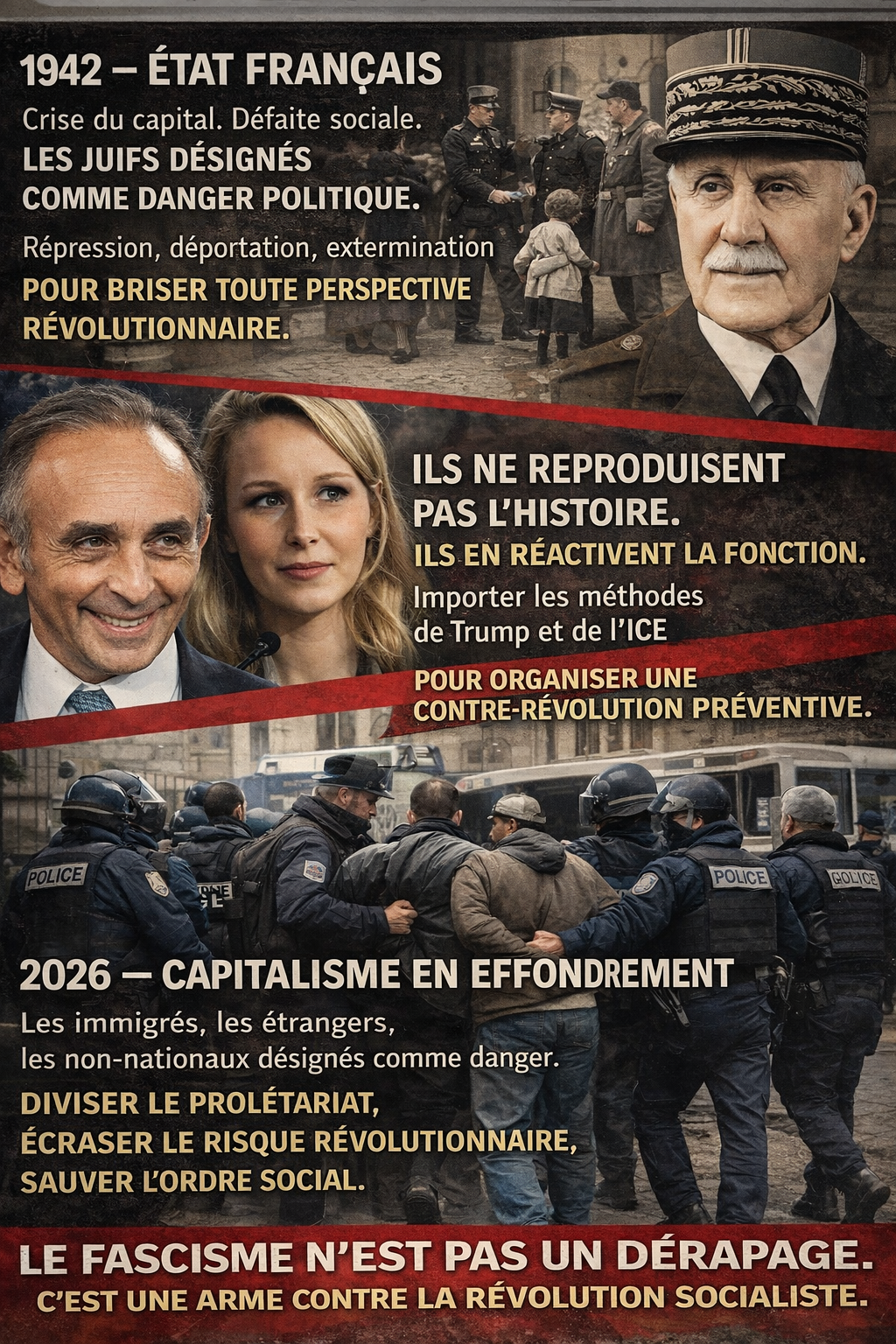 Les gouvernements, de gauche, de droite et du centre, ont tous justifié des mesures racistes, anti-immigrés, anti sans papiers, anti-musulmans, etc, et ils ont tous semé des sentiments ultra-nationalistes et fascistes dans la population. Les Pétain de demain sont prêts… Aux travailleurs de se préparer à la riposte révolutionnaire. L’exemple des travailleurs russes face au fasciste Kornilov doit servir d’exemple !