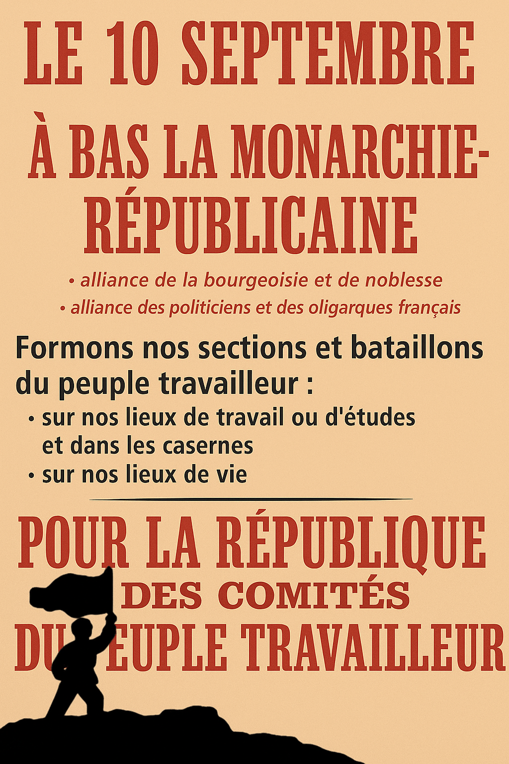 Création de soviets, dénonciation des directions syndicales, agents de la bourgeoisie dans le mouvement ouvrier, propagande en direction de la police et de l’armée, désarmement de la bourgeoisie, armement du peuple ; propagande et agitation en faveur d’une révolution socialiste, pour une société socialiste, c’est la tâche que les révolutionnaires n’ont pas remplie à grande échelle en France, mais à laquelle le mouvement du 10 septembre, leur donne l’occasion de s’atteler à nouveau !