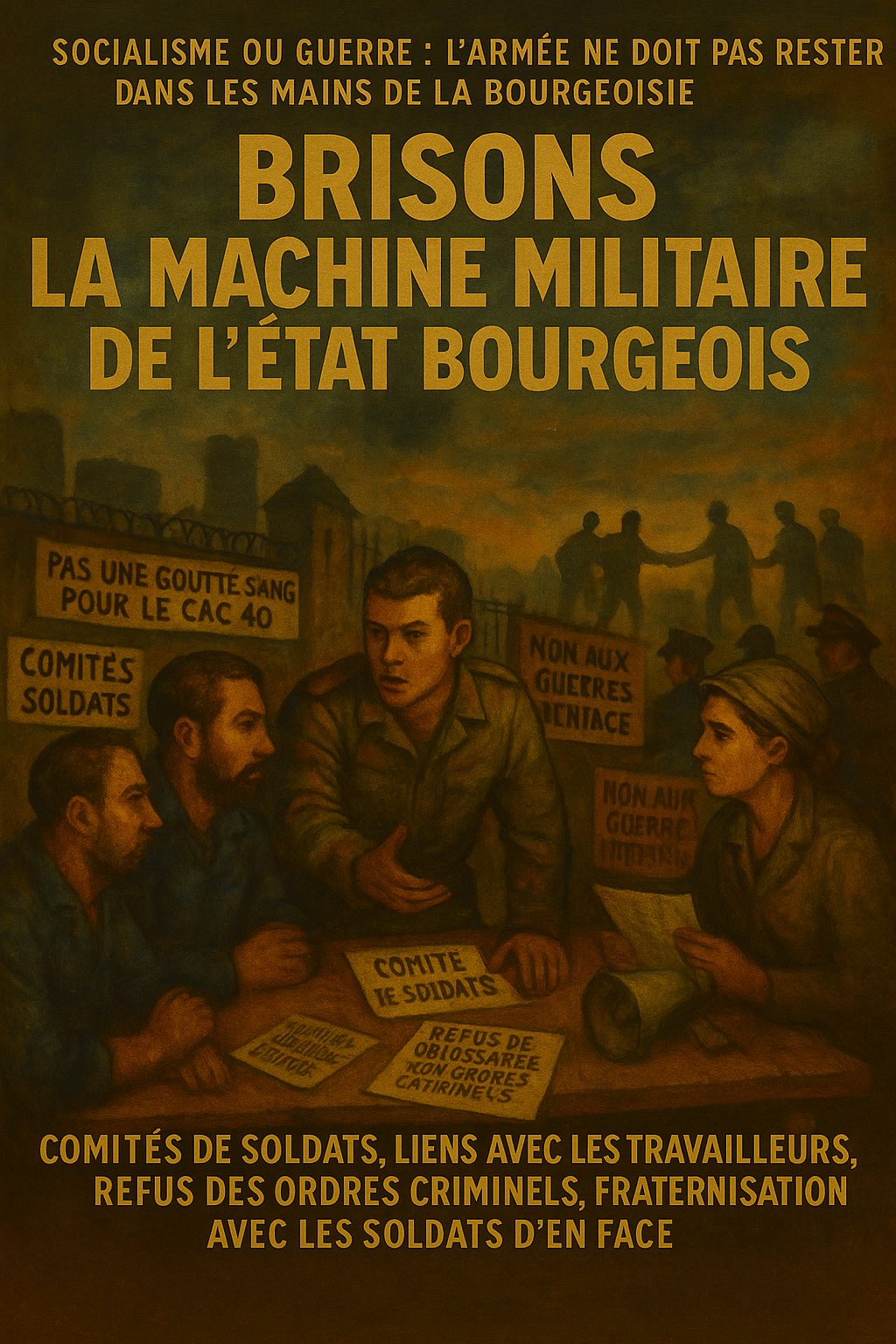 • comités de soldats dans les casernes, pour casser l’obéissance aveugle et préparer la rupture de classe au sein de l’appareil militaire ;
