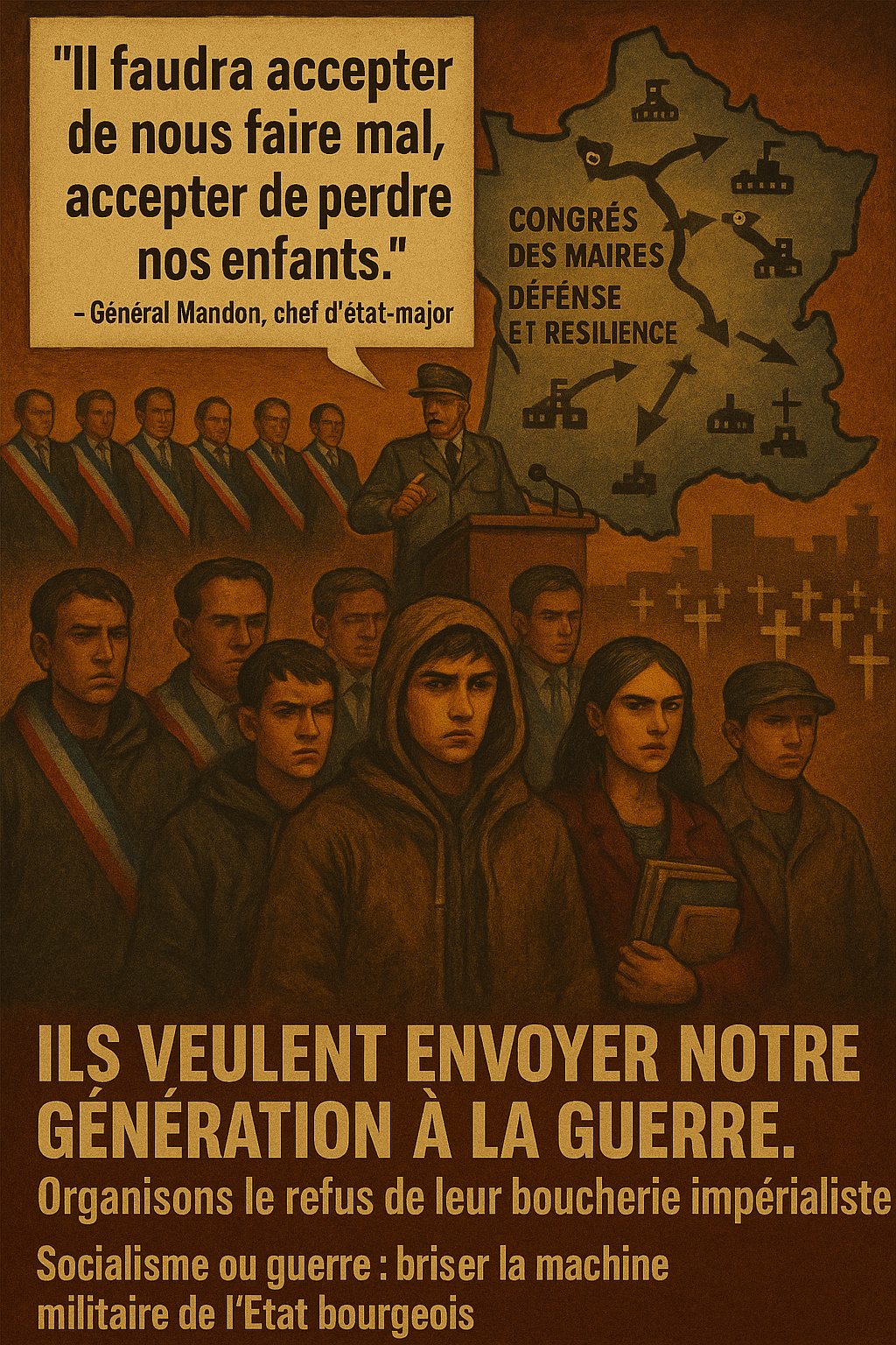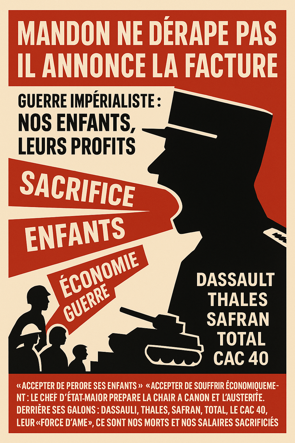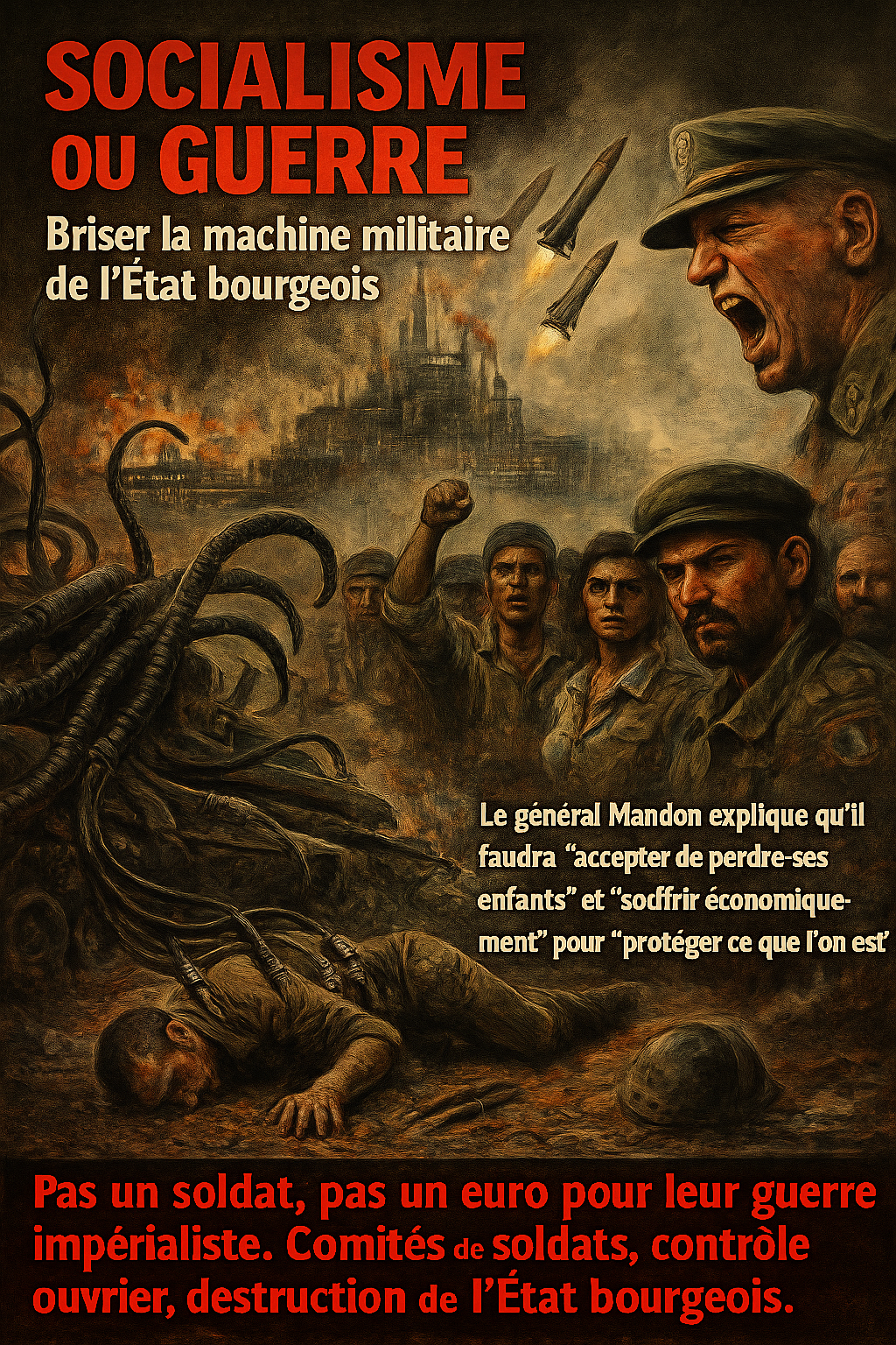 RP, NPA-R et LO disent, chacun à leur manière, que la bourgeoisie prépare la guerre et que Mandon l’avoue. Mais ils laissent les travailleurs désarmés politiquement face à cette offensive : pas d’organes à construire, pas de stratégie de prise de pouvoir, pas de plan pour désorganiser matériellement la machine de guerre.