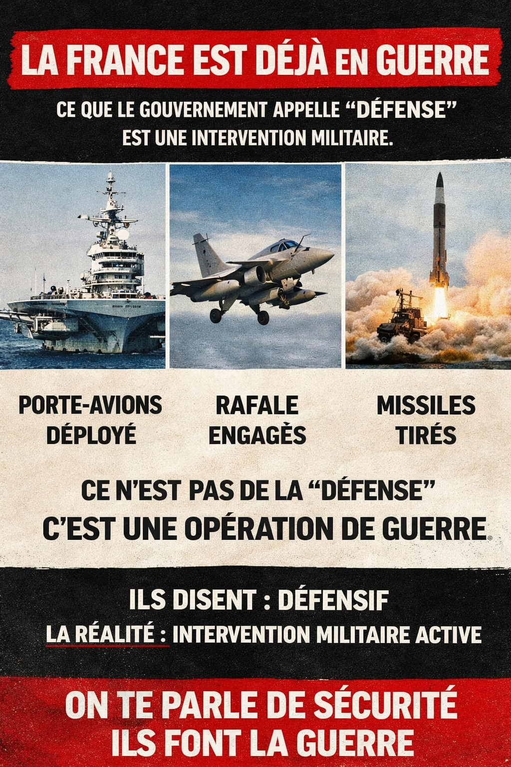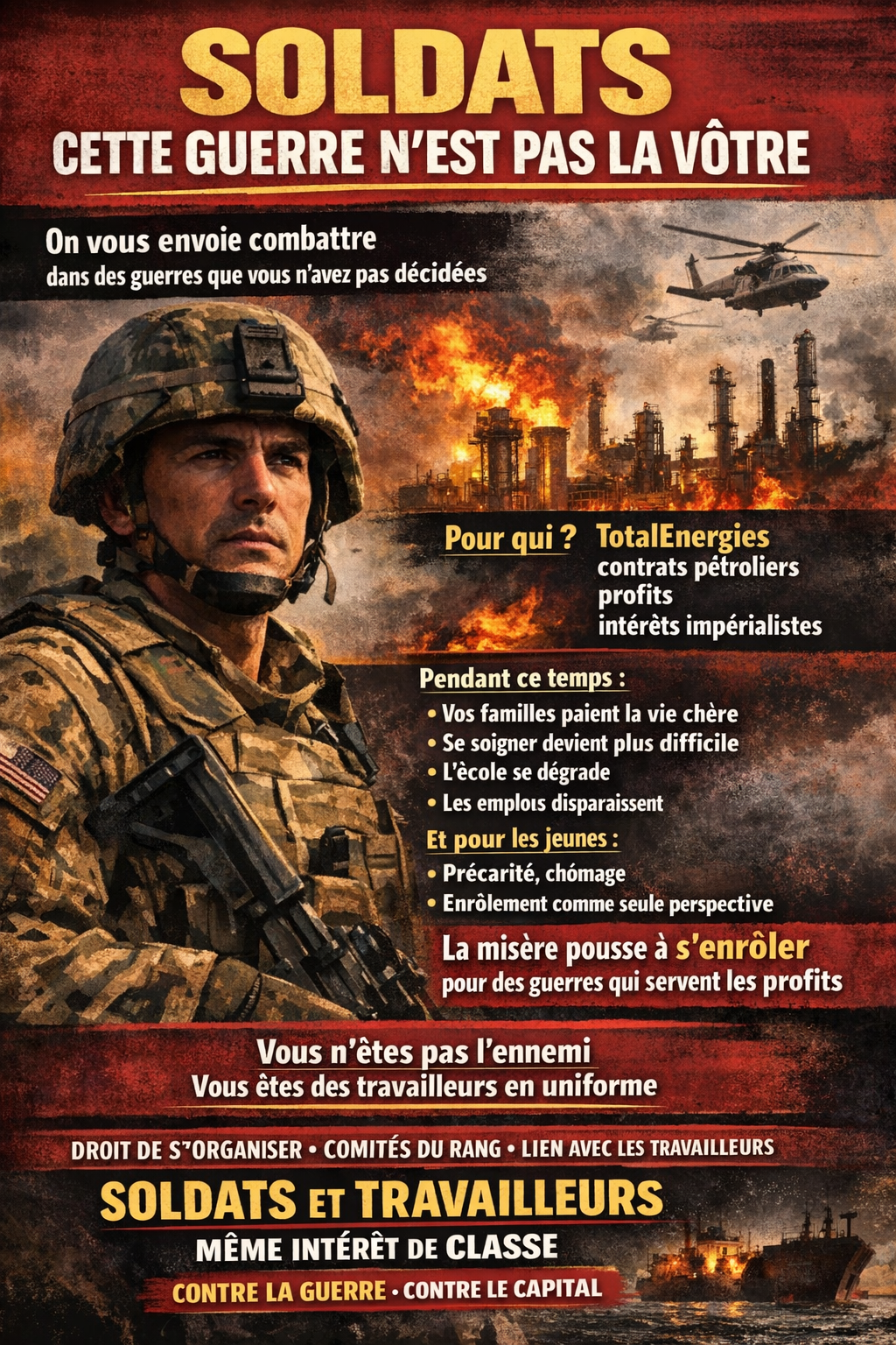 Aux soldats de la base d’Istres : les KC-135 qui se ravitaillent sur votre base servent une guerre que vous n’avez pas décidée, pour des intérêts que vous ne partagez pas. Aux gendarmes envoyés contre des grévistes : les travailleurs en face de vous défendent des droits que vos propres familles ont intérêt à voir préservés.