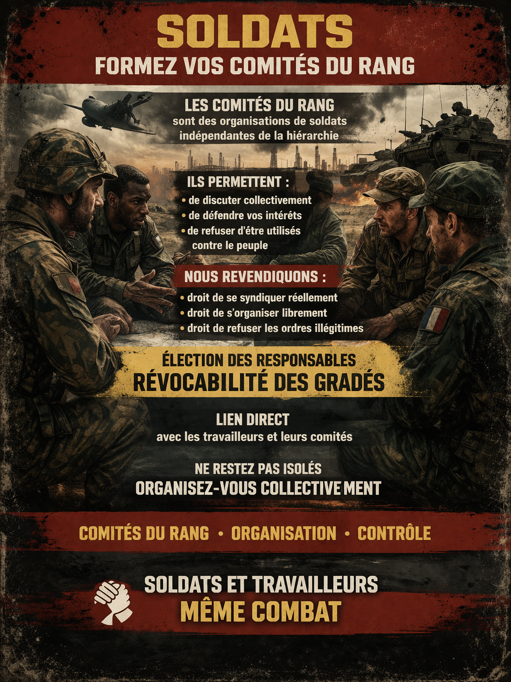 Nous revendiquons : droit de syndicalisation réelle dans les forces armées, droit de refus d’ordre, comités du rang élus dans chaque unité.