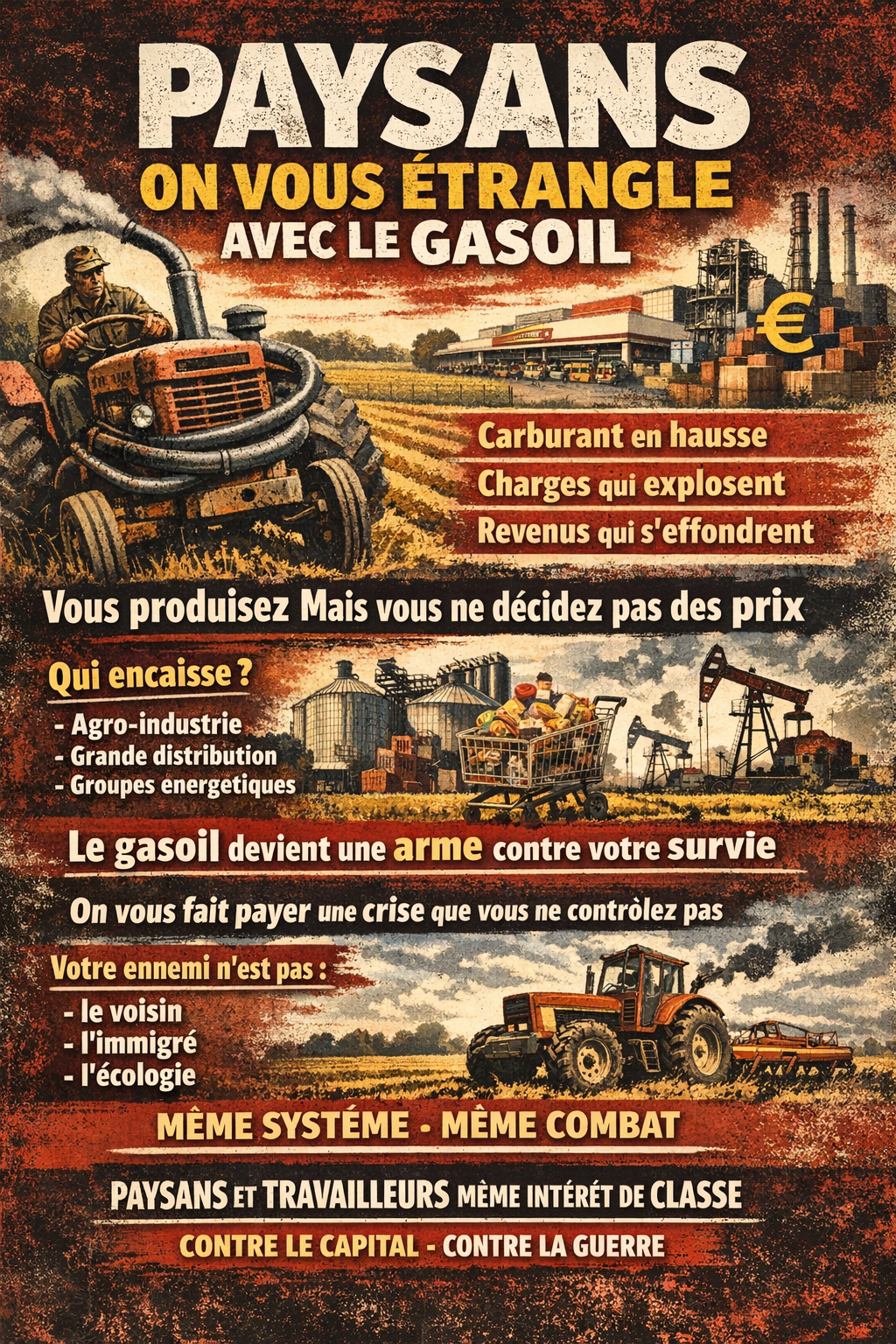 Votre colère est légitime. L’ennemi n’est pas le voisin, ni l’immigré, ni l’écologiste. L’ennemi c’est TotalEnergies, Lactalis, la grande distribution et les actionnaires qui spéculent sur votre survie. Votre travail est extorqué par les mêmes chaînes qui extorquent les salariés.