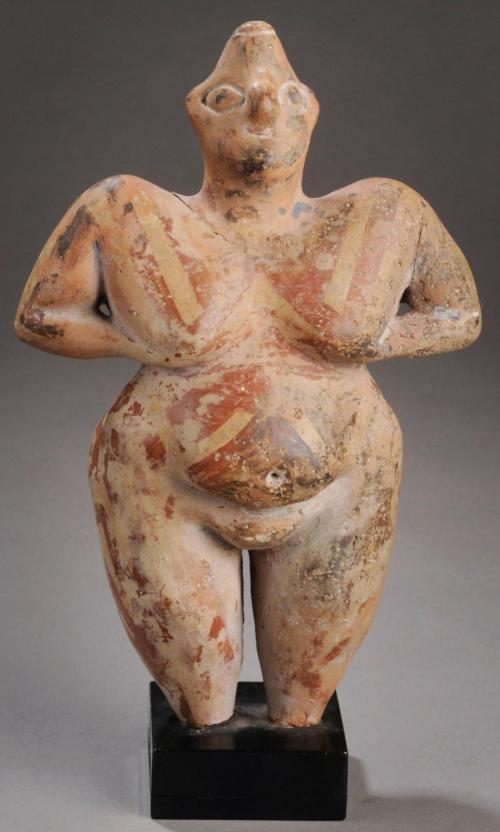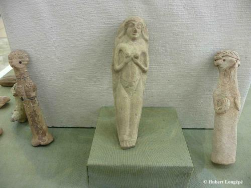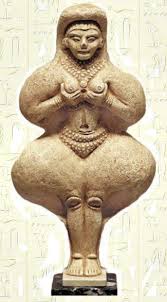 Des statuettes féminines, trouvées en Palestine et datées d’environ 4500, présentent la Déesses-Mère sous un aspect terrifiant et démoniaque (figurines trouvées à Munhata,Tel-Aviv et Shaar-Ha-Golan). Le culte de la fertilité et le culte des morts semblent solidaires aussi bien à Jéricho que dans les civilisations de Hacilar et de Çatal Hüyük… La principale divinité était la déesse, présentée sous trois aspects : jeune femme, mère donnant naissance à un enfant (ou à un taureau) et vieille (accompagnée parfois d’un oiseau de proie)… Des reliefs de la déesse, parfois hauts de deux mètres, modelés en plâtre étaient fixés aux murs… A Hacilar, à un niveau daté de 5700, la déesse est montrée assise sur un léopard ou debout, tenant le petit d’un léopard… Dans la culture dite du Tell Halaf… on n’a pas trouvé de figurines masculines, tandis que les images de la déesse abondent ; accompagnée de colombes, avec des seins exagérés, représentée mainte fois en position accroupie, il est difficile de ne pas reconnaître l’image exemplaire de la Déesse-Mère.