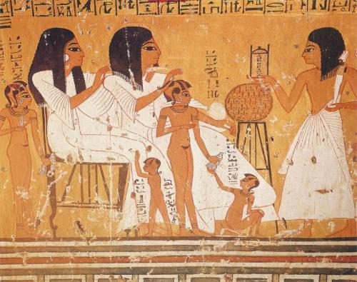 « Les jeunes filles, aux traits fins, leur chevelure brune ou noire portée en queue de cheval ou en boucles sur le sommet de la tête, affichant avec coquetterie leurs corps splendides à petits seins, vêtus uniquement d’un caleçon en étoffe de laine ou en peau d’animal ou jouant avec leurs léopards familiers, rapportés par les chasseurs des forêts de pin et de genévrier qui entouraient la vallée. Ailleurs […] les femmes plus âgées, mères ou futures mères, de formes mûres et sans aucun doute nues ou vêtues de tabliers ou de jupes ficelle, leur chevelure nouée en chignon à l’arrière de la tête, comme le voulait leur statut de femme mariée. Ici une jeune femme jouait avec son enfant assis sur sa poitrine ou la tétant ; près de là […] une femme aux cheveux sombres se reposant à l’ombre tandis que son jeune enfant se penche vers elle et murmure dans son oreille, ou les ébats d’un enfant sur le dos de sa mère qui s’accroupit avec difficulté en raison de son évidente grossesse… »