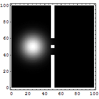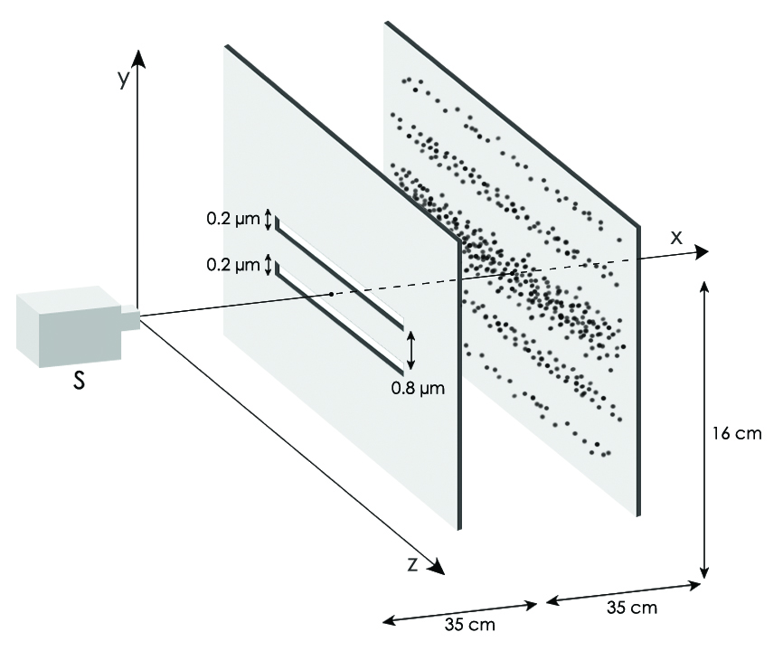 Nous considérons d’abord le comportement de balles de fusil dans un montage expérimental. Le fusil tire en direction de deux fentes qui sont en face du fusil dans une paroi, avec un écran situé en peu en arrière des fentes.
