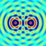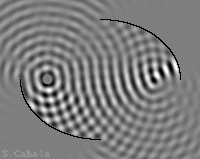 On dit que la courbe observée, avec deux fentes ouvertes, présente des interférences. Dans notre cas, nous observons que l’onde initiale est diffractée par les trous et que de nouvelles ondes circulaires sont émises par chaque trou. Si nous fermons un seul trou à la fois et si nous mesurons la distribution d’intensité à l’absorbeur, nous trouvons une courbe d’intensité très simple qui n’est pas la somme mais l’interférence entre les deux ondes provenant d’un trou. A certains endroits (là où la courbe finale a ses maximums) les ondes sont dites « en phase » et les valeurs des pointes des amplitudes (des courbes avec un seul trou) s’ajoutent pour donner l’amplitude totale. A ces endroits, nous dirons que les ondes « interfèrent constructivement ». Il y aura une telle interférence constructive chaque fois que la distance du détecteur à un trou est plus grande (ou plus courte) que la distance à l’autre trou d’un nombre entier de longueurs d’onde (la longueur d’onde étant la distance entre deux maximums de l’onde).