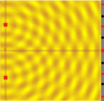 Aux endroits où les deux ondes atteignent le détecteur avec une différence de phase d’un demi tour (valeur pi), on dit alors qu’elles sont « en opposition de phase » (l’une à un maxi quand l’autre est à un mini et inversement), le mouvement de l’onde résultant (celui avec les deux trous ouverts) est la différence des deux amplitudes (alors que précédemment, c’était la somme). Les ondes « interfèrent alors destructivement »… Nous trouvons de telles valeurs minimales lorsque la distance entre le premier trou et le détecteur diffère de la distance entre le deuxième trou et le détecteur d’un nombre impair de demi-longueurs d’onde…