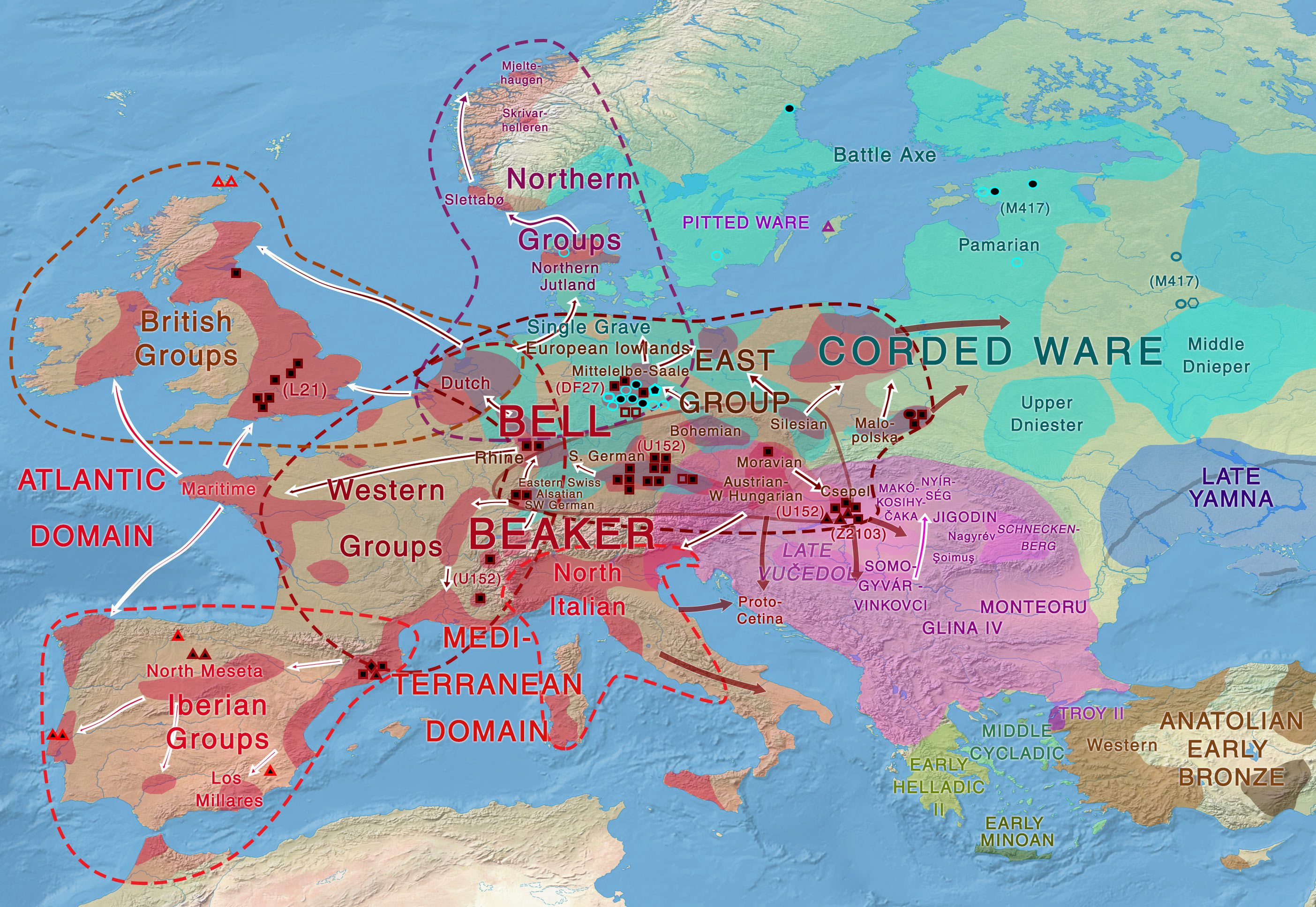 Introduction : les textes cités ici sont des hypothèses des archéologues qui sont contestés par d’autres archéologues. Il n’y a pas consensus sur l’interprétation des successions de civilisations en Europe lors de la transition néolithique / âge de bronze. Certains auteurs estiment que la diffusion des nouvelles cultures est simplement la progression de l’influence d’idées et de techniques nouvelles. D’autres pensent que ce n’est que marginal et que le développement de cultures nouvelles est une révolution portée par des populations nouvelles, envahissant le territoire. Les nouvelles découvertes de ces révolutions sociales en Angleterre sont un argument supplémentaire en faveur de l’idée d’invasion portant une civilisation nouvelle. Dans ce cas, l’ancienne population a même disparu en quasi totalité, la vieille population néolithique cède complètement la place à la nouvelle population de l’âge du bronze ! Cependant, on ne peut pas être certains que les cartes sur les restes de tel type bien particulier de vases correspondent à des signes d’occupation d’une même population.