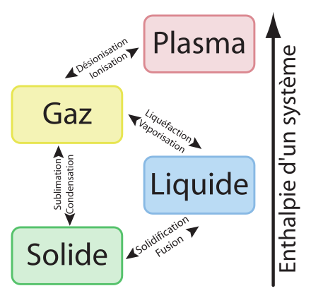 On va voir qu’en fait, il existe une multitude d’autres états de la matière : plasma, granulaire, quasi-cristal, superfluide, supraconducteur, cristaux liquides, condensat de Bose-Einstein, ferromagnétique et anti-ferromagnétique, polyphasique (émulsions, pâtes, mousses, poudres, gels, aérosols, etc.) ou encore état hors équilibre thermodynamique.