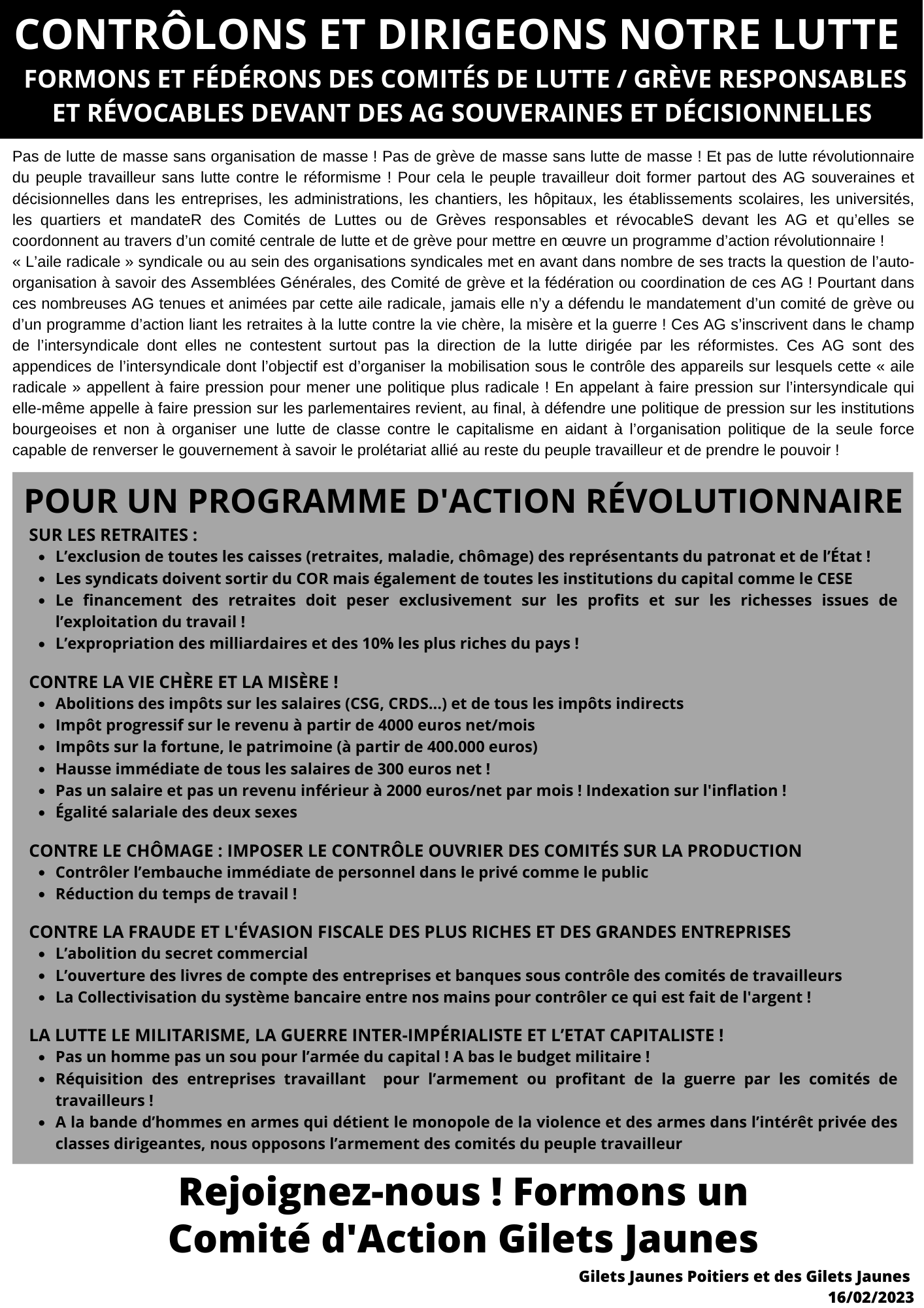 Pour Fernand Pelloutier, fondateur des Bourses du travail, la tâche du syndicalisme est « d’habituer (le peuple travailleur) à se passer de gouvernant. (il) doit donc conseiller, instruire, mais non diriger ». Or telle n’est pas la politique de l’intersyndicale qui gouverne les luttes comme le gouvernement capitaliste gouverne les citoyens ! Ce n’est pas de ce type de direction dont les travailleurs ont besoin ! Ils doivent s’auto-gouverner et pour s’auto-gouverner, il faut se diriger soi-même !Et cela commence par la mise en place de comités de grève dans les entreprises et sur ses lieux de vie. Ces comités sont des embryons du futur autogouvernement du peuple en élisant une direction de la lutte responsable et révocable devant les assemblées de lutte du peuple. Leur coordination sera alors la prémisse de nouvelles Communes Révolutionnaires à I’image des Communes de Paris, Marseille, Lyon et Bordeaux en 1871, dernière grande insurrection révolutionnaire du Peuple en France et 1er gouvernement des pauvres, des opprimés et des exploités.