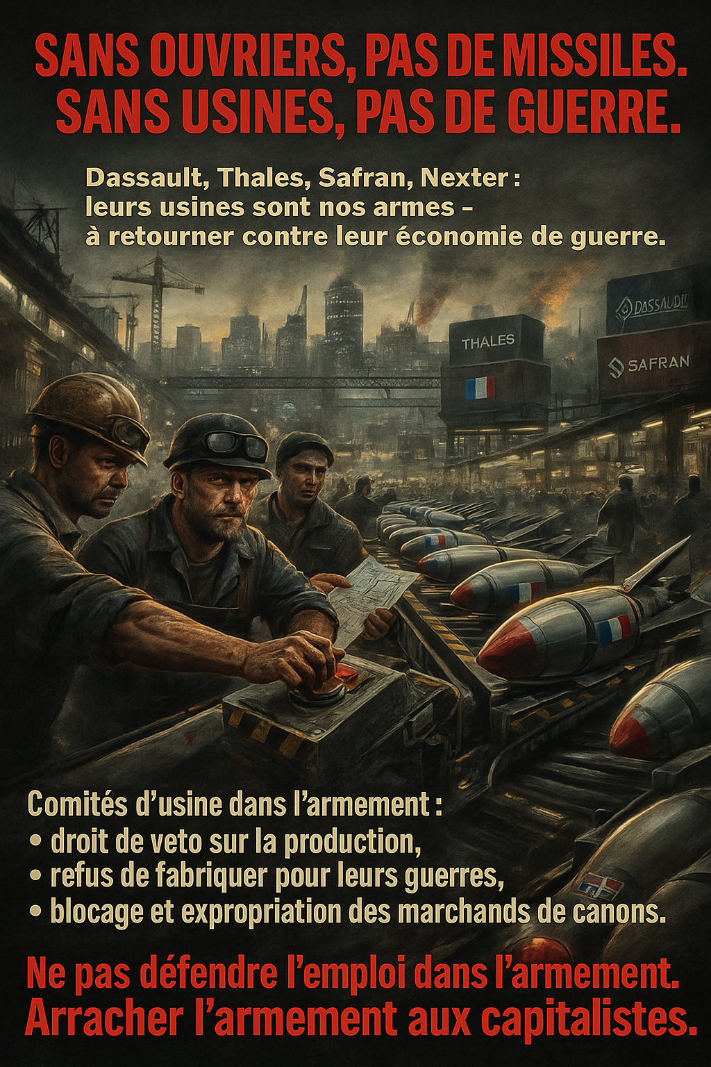 • revendiquer l’expropriation sans indemnité des groupes d’armement (Dassault, Thales, Safran, Nexter, etc.) sous contrôle ouvrier ;