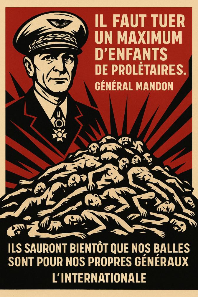 Le général Mandon fait maintenant des réflexions selon lesquelles les soldats français ne risquent plus rien et les jeunes volontaires ne participent à aucune guerre, qu’ils ne quitteront pas la France ! Lui qui disait que le peuple devait être prêt à sacrifier ses enfants !