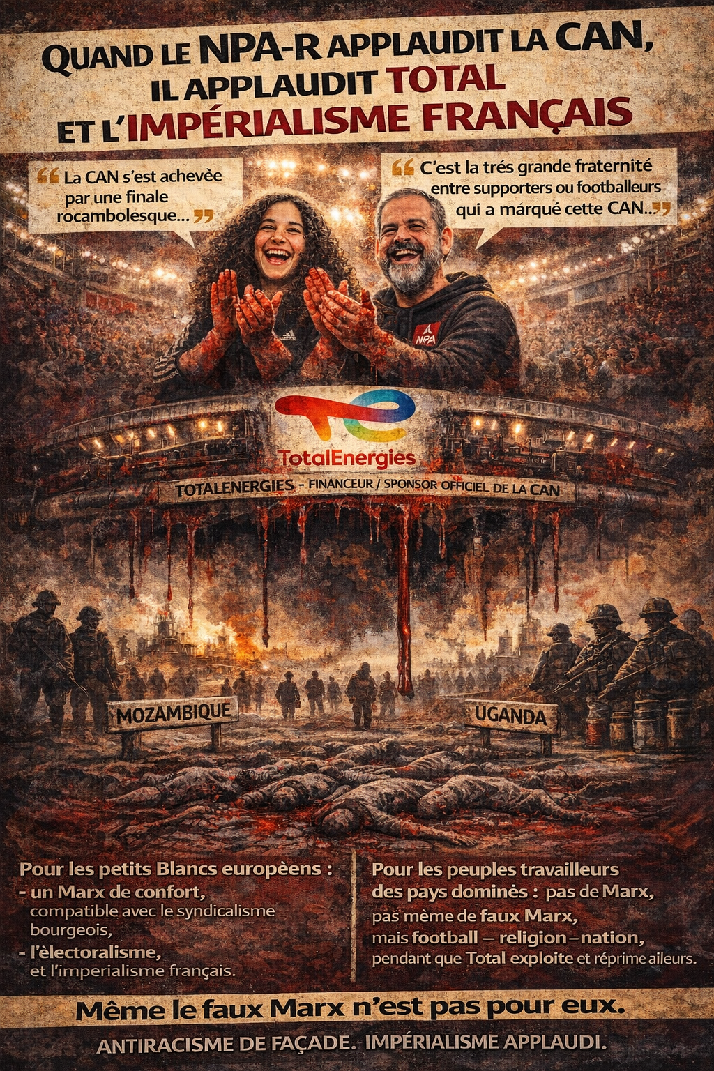 Pour les élections Municipales, n’hésitons pas à traduire en images les convictions des porte-parole du NPA-R Selam Labib et Gaël Quirante, qui porte-parole de l’aristocratie ouvrière française, ont su remercier Total pour le spectacle de la CAN :